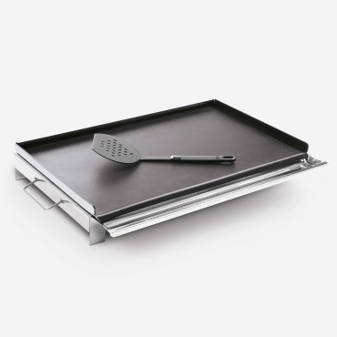 Plancha en aluminium, avec traitement antiadhésif, insérée dans un support en acier inox. Parfaite pour des cuissons light, elle se pose directement sur la grille du barbecue pour cuire à feu vif.