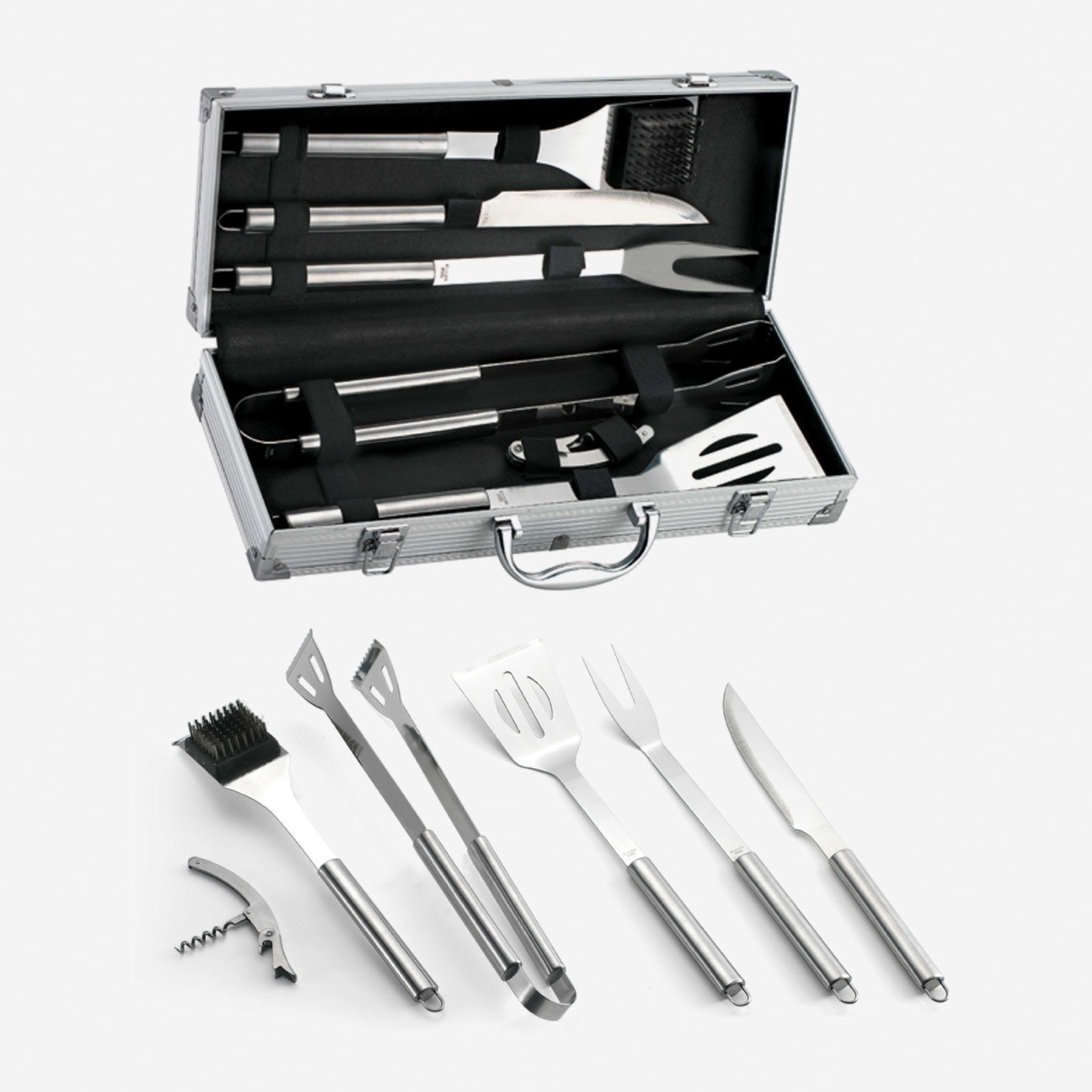 Ensemble complet d’ustensiles en acier inox pour chaque étape de la cuisson, contenu dans une mallette. L'ensemble comprend :